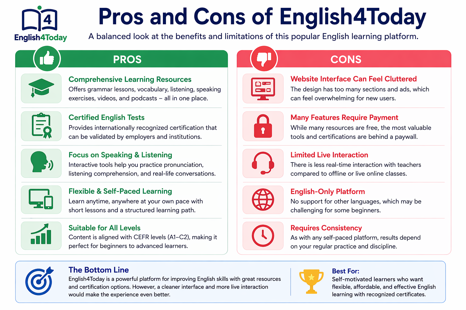 Discover how English4Today helps learners improve their English skills with interactive lessons, grammar resources, speaking practice, and certified tests. This all-in-one platform is perfect for beginners and advanced users looking to boost fluency and confidence.